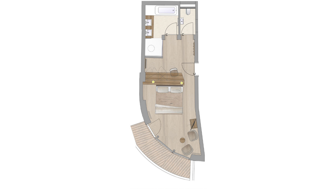 ca. 38 m², elegantes Doppelzimmer in natürlichen Farben gehalten und edler Eichenholz-Ausstattung, Parkettboden, Badezimmer mit Badewanne und Dusche, Südbalkon mit Blick zum Hartkaiser und Kaisergarten Grundriss ansehen