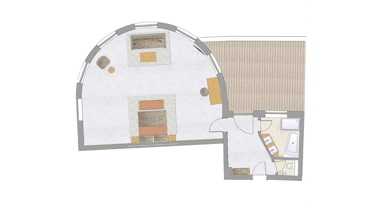 Kaiser & Königin! Unsere halbrunde 1-Raum-Suite Opal vermählt das Bergmassiv Wilder Kaiser mit der Zirbe, der Baum-Königin der Alpen. Der Zauber der Zirbe liegt darin, dass sie nachgewiesenermaßen den Herzschlag senkt. So schlafen Sie himmlisch in dieser Suite, die Stubenholzflair mit edlen hellen Stoffen und Marmorboden elegant vereint. Dazu ein Rundumblick auf den Wilden Kaiser und ein extragroßer Balkon. Unsere Suite für majestätische Urlaubsgefühle.